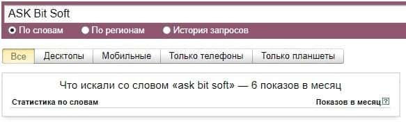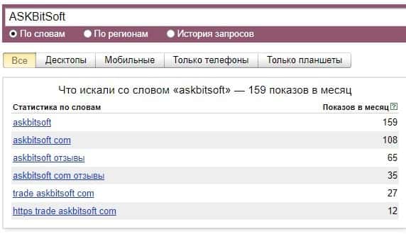 Что касается бренда "ASKBitSoft", то здесь шарлатанская кухня немного преуспела и смогла набрать в поисковой системе Яндекс 159 показов за последний месяц.