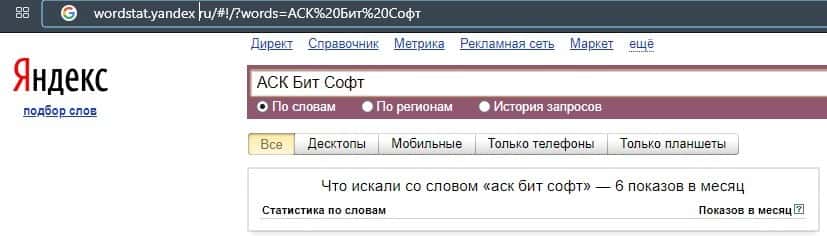 Далее представлена информация касательно популярности бренда лохотрона в данной вариации "ASK Bit Soft". Как оказалось, мошенники слабо популярны в Яндекс.