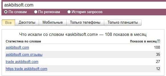 Судьба бренда "askbitsoft.com", который обозначает официальный сайт лохотрона, немного иная и насчитывает 108 показов за последний месяц.