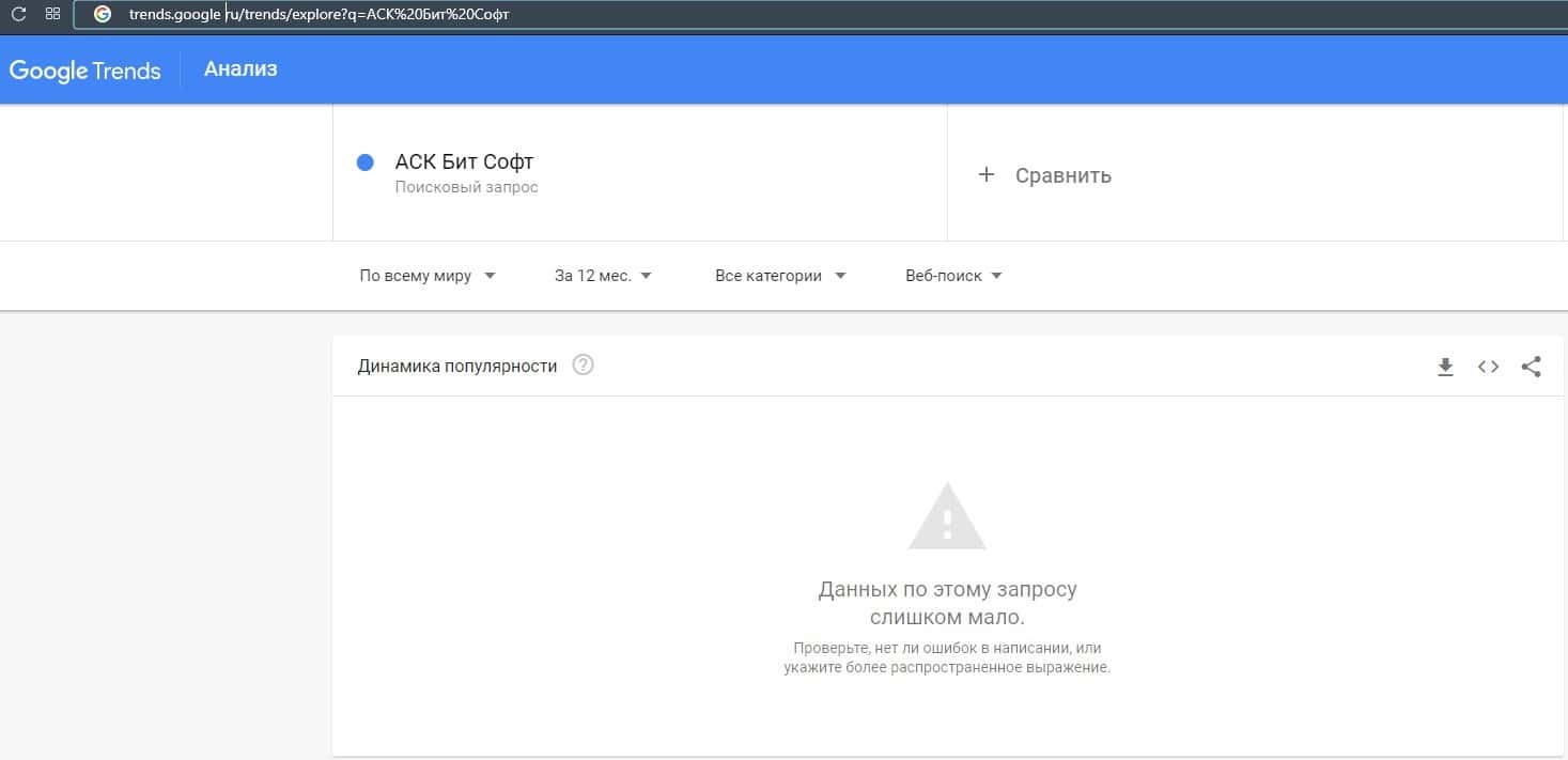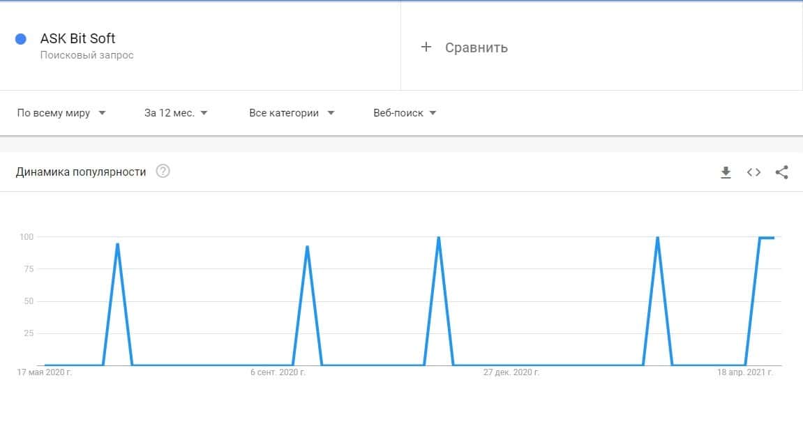 Та же история и с поисковым запросом бренда "ASK Bit Soft", где Гугл Трендс зафиксировал кое-какую активность за последнее время.