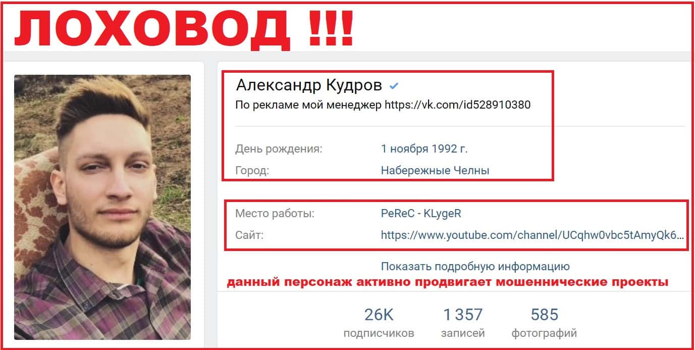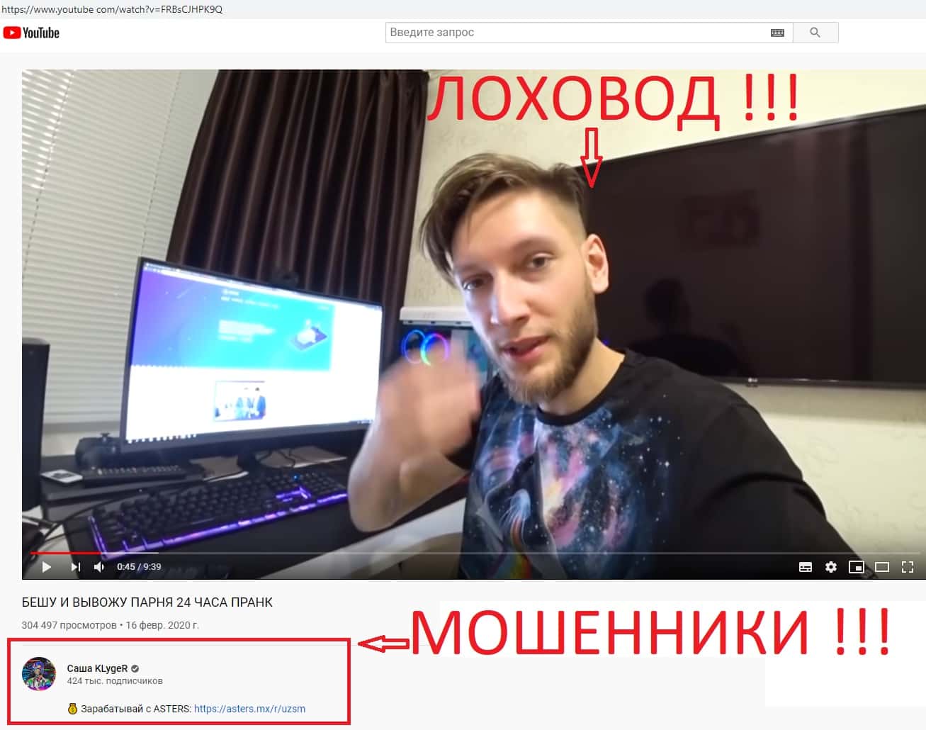 Речь идет о видео-блогере, он же лоховод Саша KLygeR, который активно рекламировал откровенный скаммерский проект Астерс Мх, и таким образом этот персонаж, принимая участие в привлечение наивных интернет-пользователей в scam-компанию, считает своих подписчиков за обыкновенных лохов, в том числе за счет которых он имеет определеннную выгоду в виде оплаты за привлеченную будущую жертву на скаммерский сайт Астерс Мх.