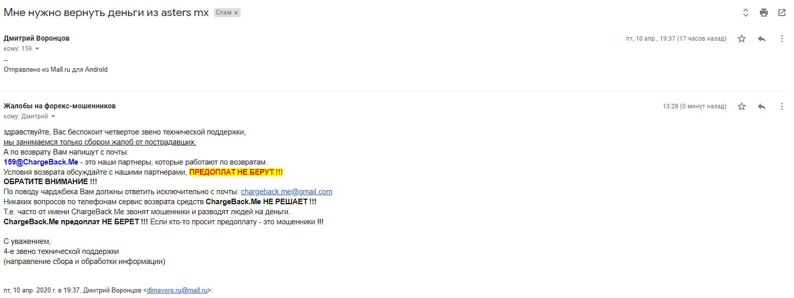 На публикации ниже предлагаем ознакомится с жалобой от еще одного пострадавшего клиента мошеннической онлайн-организации Asters Mx, где кидают людей на деньги, в письме обманутый пользователь упоминает того, кто его привел к этим аферистам.