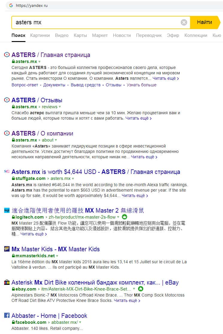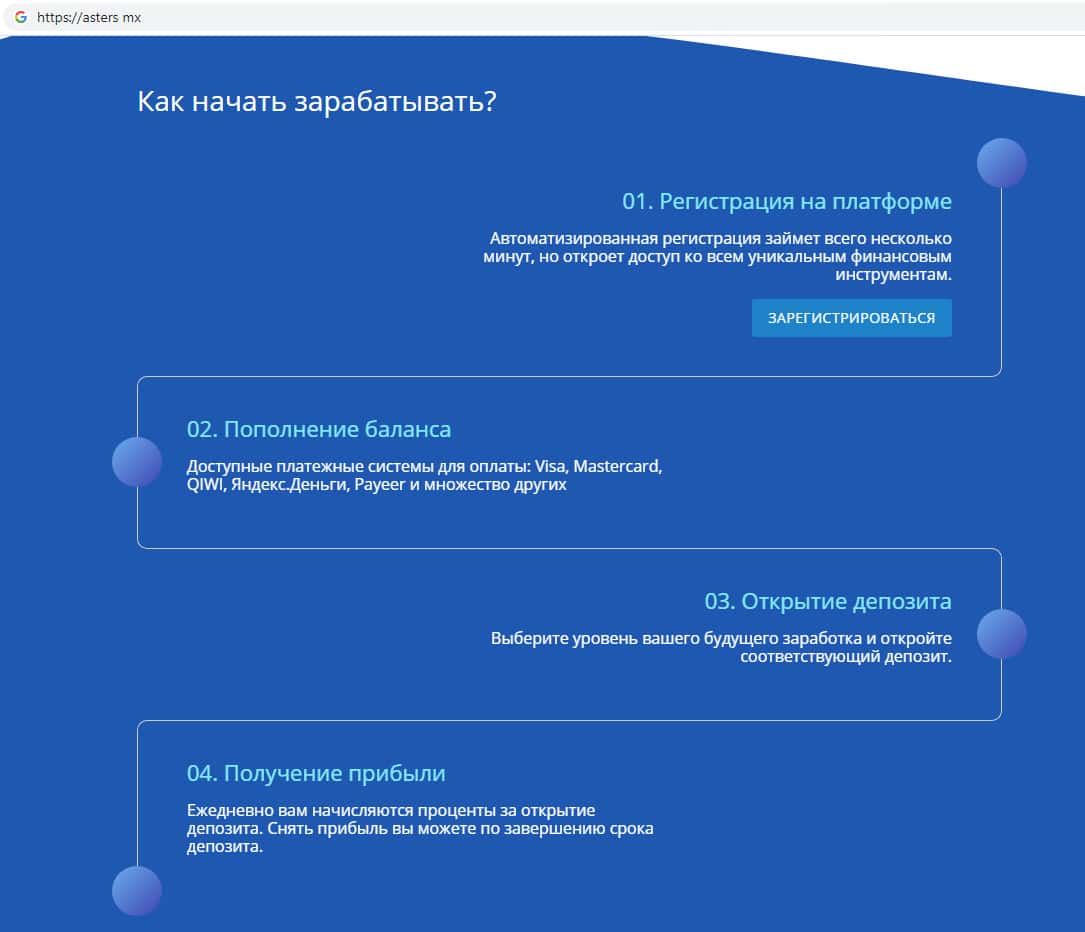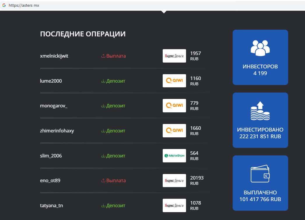 Прикрыв свой онлайн-сервис, создатели откровенного онлайн-лохотрона под названием Asters Mx, действовали по весьма обычной для любого мошенника схеме: придумали сказки о пассивном заработке и преподнесли это доверчивому интернет-пользователю, после чего собрали быстренько деньги и ушли в неизвестном для обманутых клиентов направлении.