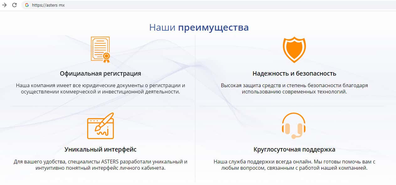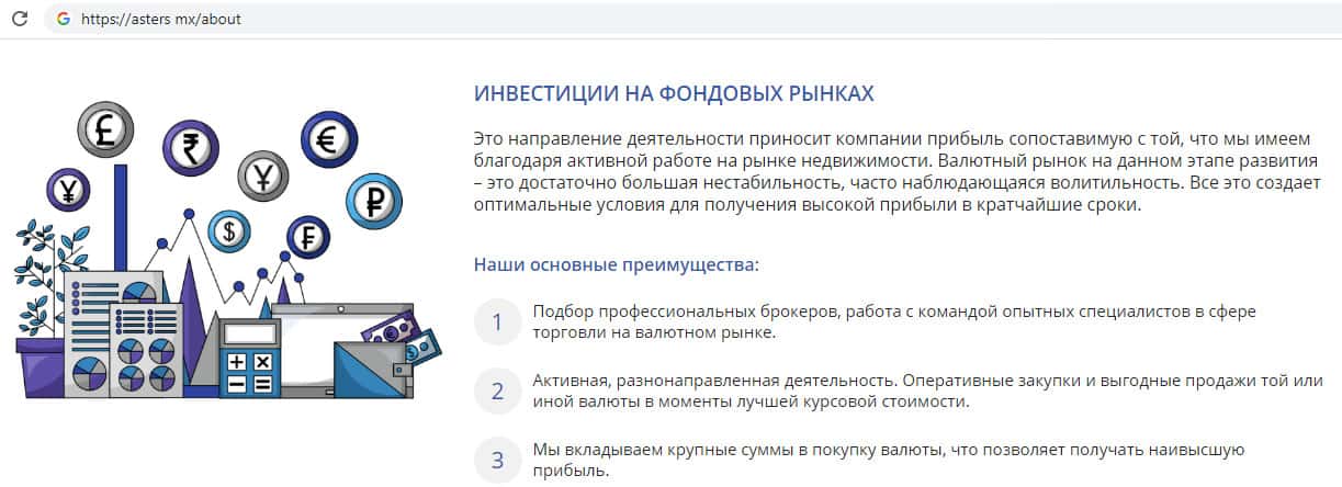 Мошеннический сайт Asters Mx стандартный и не интересный, очень похож на сайты подобных жульнических контор. Вся информация на сайте полностью на русском языке. Официальный интернет-ресурс аферистов Астерс приукрашен картинками из интернета, а так же лживыми обещаниями о возможности получения прибыли.