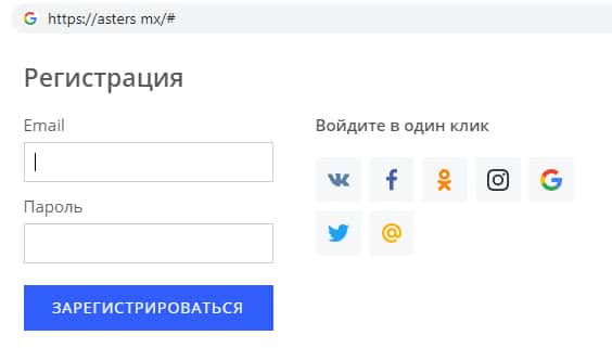 Жулики Астерс предлагают зарегистрироваться пользователям указав свой адрес электронной почты и пароль, либо же войти в один клик нажав ссылку на социальные сети. Зарегистрировавшись через социальные сети на сайте аферистов Asters Mx будьте уверенны в том, что все Ваши личные данные автоматически сохраняются на мошенническом сайте.