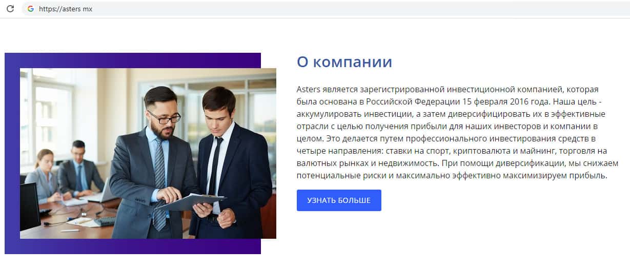 Жулики Asters Mx на своем официальном сайте рассказывают сказки о том, что их компания является зарегистрированной и якобы занимается профессиональным инвестированием средств в четырех направлениях: ставки на спорт, криптовалюта и майнинг, торговля на валютных рынках и недвижимость.