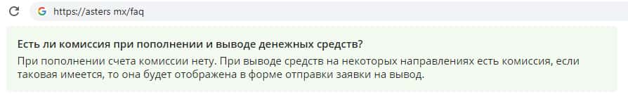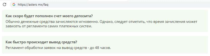 В случае возникновения каких-либо проблем связанных с выводом денежных средств, мошенники Asters Mx всегда будут ссылаться на предлагаемые ответы. Шуллера Астерс пишут о том, что запрос на вывод денежных средств со счета обрабатывается по времени значительно дольше, чем пополнение счета.