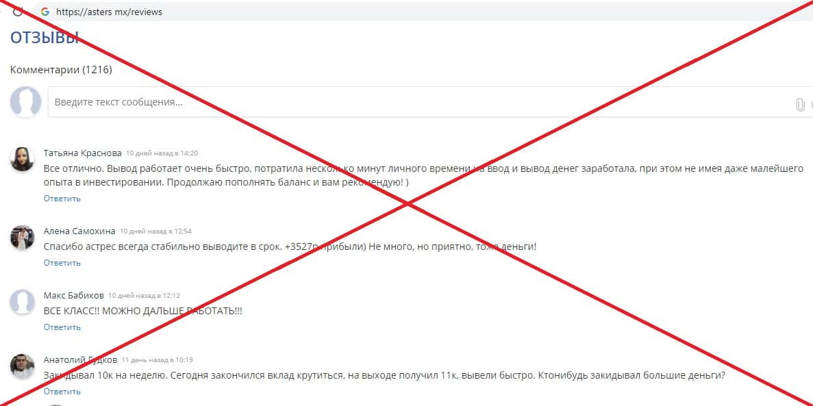 - Фальшивые пользовательские отзывы, которые опубликованы на жульническом сайте Asters Mx