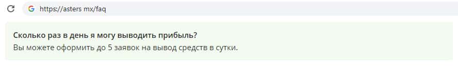 Шуллера Астерс утверждают, что зарегистрированный пользователь их сайта имеет право подать до пяти заявок на вывод средств в сутки. Вся информация, которую мошенники Asters Mx пишут о правилах вывода денежных средств не является гарантией того, что они вернут Вам все деньги.
