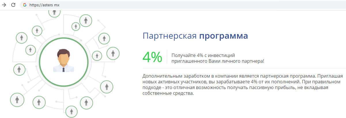 Шуллера Астерс разработали некую партнерскую программу, которая существует для привлечения как можно большего количества клиентов в их контору. Мошенники Asters Mx предлагают за счет этого снизить комиссию тому, кто пригласил своего друга в данную организацию.
