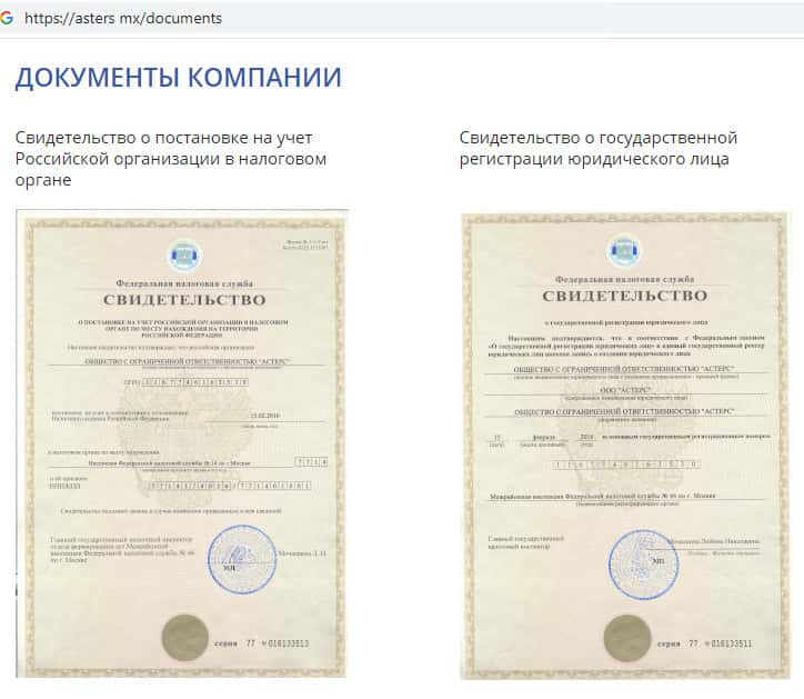 Вместо лицензии жулики Asters Mx предлагают пользователю взглянуть на сертификат о регистрации компании. На самом деле данная мошенническая уловка рассчитана на невнимательного пользователя. Данный документ очень легко подделать особенно если он в электронном варианте !!!