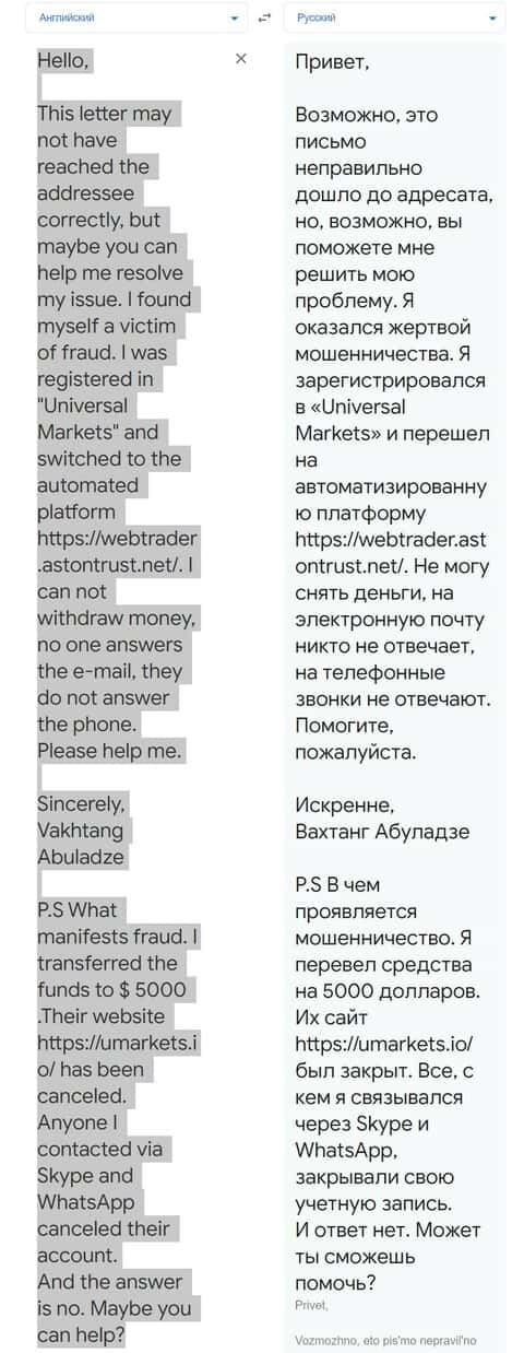 Также мы решили опубликовать перевод всего письма от человека на русский язык, где мошенническая контора Астон Траст и ее пособники кинули жертву на не малую сумму денег.