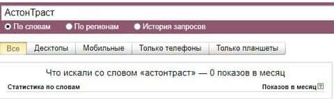 Следующим вариантом, мы решили пробить информацию бренда "АстонТраст" и, согласно Яндекс Вордстат, запросов в поисковой системе также не было обнаружено.