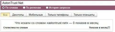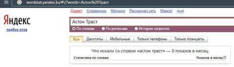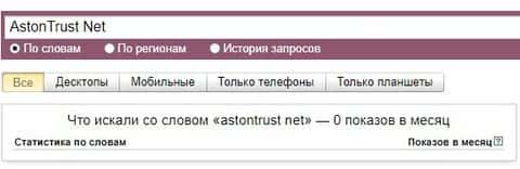 Если ввести бренд в виде официального сайта конторы без точки "AstonTrust Net", то поисковая система Яндекс выдает 0 показов за месяц.
