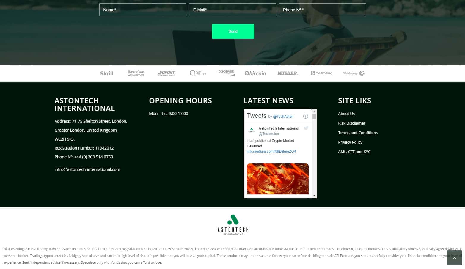 Завершается же подвальный сайт у аферистов Astontech-International довольно стандартно и ожидаемо, а именно формой для обратной связи, а так же ссылками на различные разделы подвального сайта мошенников Астонтеч Интернэшинал и предупреждением о рисках. На изображении ниже вы можете наглядно увидеть окончание сайта проходимцев.