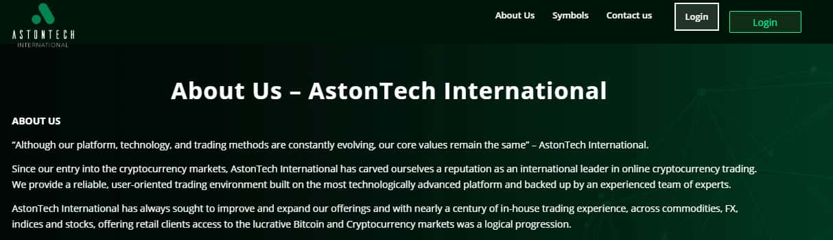 Астонтеч Интернэшинал - очередные мошенники сети интернет, которые занимаются наглым разводом пользователей сети интернет под предлогом торговли криптовалютой, в ходе которых жулики Astontech-International кидают клиентуру. В связи с этим иметь дело и сотрудничать с аферистами Астонтеч Интернэшинал определенно не рекомендуем !!!
