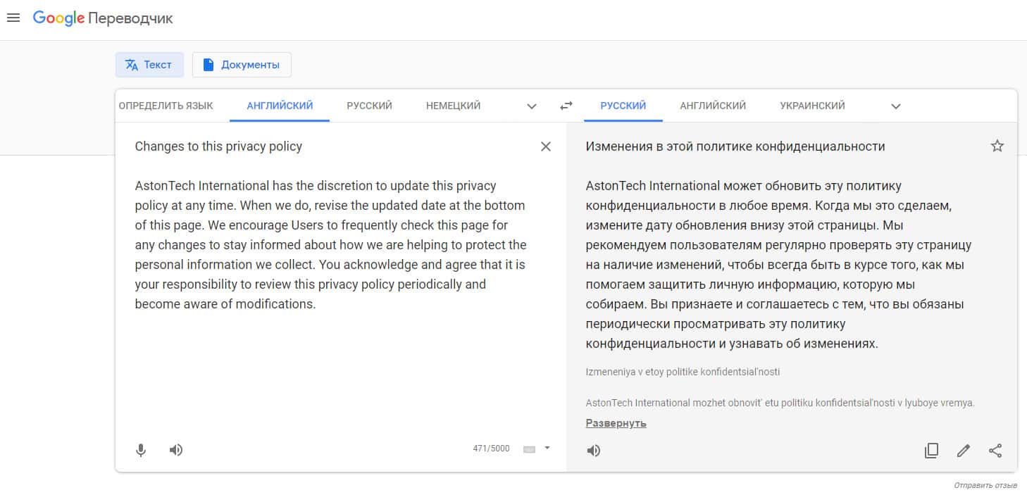 После в политике конфиденциальности у аферистов Astontech-International следует условие о том, что мошенники Астонтеч Интернэшинал могут в любой момент по своему личному и персональному усмотрению изменить данную политику конфиденциальности. На изображении, расположенном ниже. вы можете наглядно увидеть данный раздел политики.