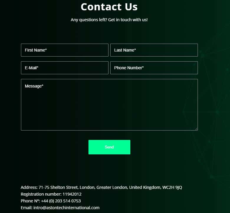 Под свои контакты мошенники Астонтеч Интернэшинал сигналы отвели отдельный раздел своего подвального сайта, где перечислили нормальное количество контактов, однако никакого подтверждения их реальности опять же не приводится. Однако заметно, что шулера Astontech-International все же хотят идти на контакт с клиентурой. Итак контакты аферистов: