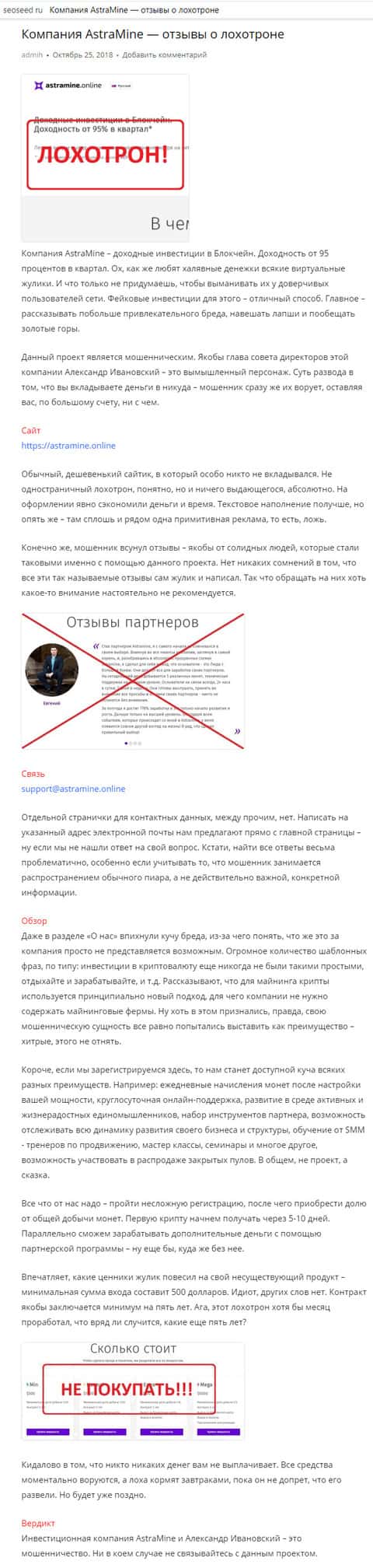 - Статья о мошеннической конторе AstraMine на веб-сайте seoseed ru