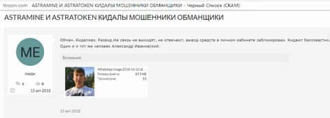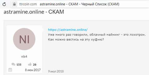 На форуме ttrcoin, на этот раз в другой теме, имеется еще один отзыв о кидалах АстраМайн. Когда мошенникам нужны ваши деньги, они навешают вам на уши любую лапшу. Когда же дело дойдёт до вывода средств или связи с ними – тут-то клиент и поймёт, что его облапошили.