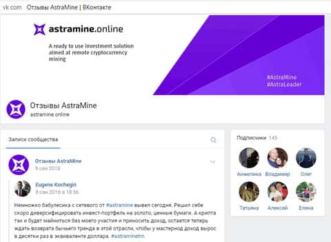 Чуть лучше ситуация обстоит в социальной сети ВКонтакте. Так потенциальных лохов целых 150. Ну и засланные казачки AstraMine подогревают интерес, рассказывая, как выводят сотни и тысячи баксов с этой шарашки. Надеемся, что никто на эту мошенническую контору не поведётся.