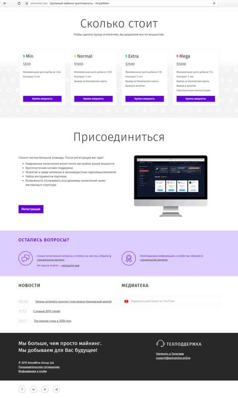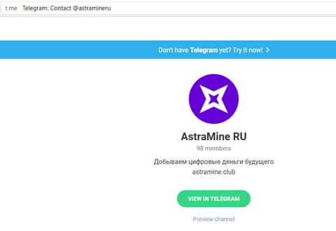 На сайте AstraMine хоть и указан почтовый ящик, но, как понимаете, шансы что вам кто-то ответит – мизерный. Основным каналом связи с жуликами АстраМайн является Telegram-канал, через который они также агитируют всё новых и новых лохов.