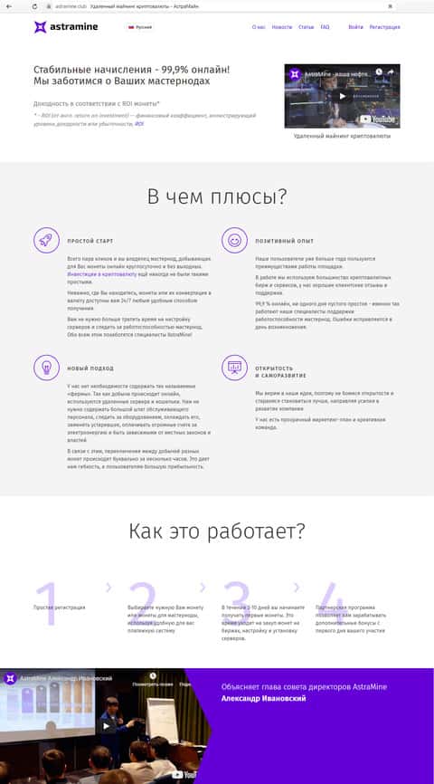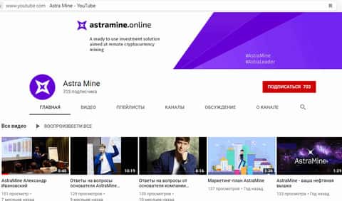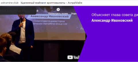 Также у аферистов АстраМайн имеется некий канал на Ютубе. Там постоянно светит лицом некий Александр Ивановский, который, как мы подозреваем, к реальным управленцам AstraMine не имеет никакого отношения, а является лишь обычным подставным лицом.