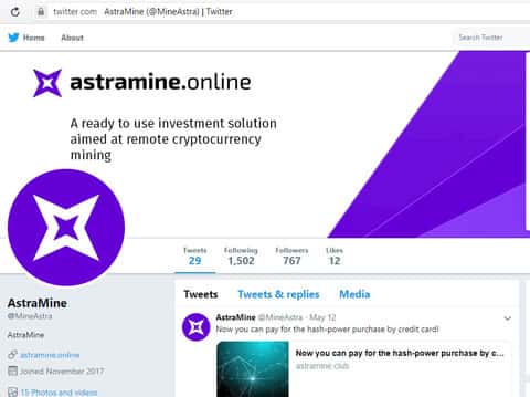 Как мы можем видеть, в социальной сети Twitter ситуация обстоит еще лучше. Тут у шулеров AstraMine целых 767 подписчиков. Как видите, АстраМайн пытаются также влиять на западную аудиторию, чтобы расширять аудиторию потенциальных лохов.