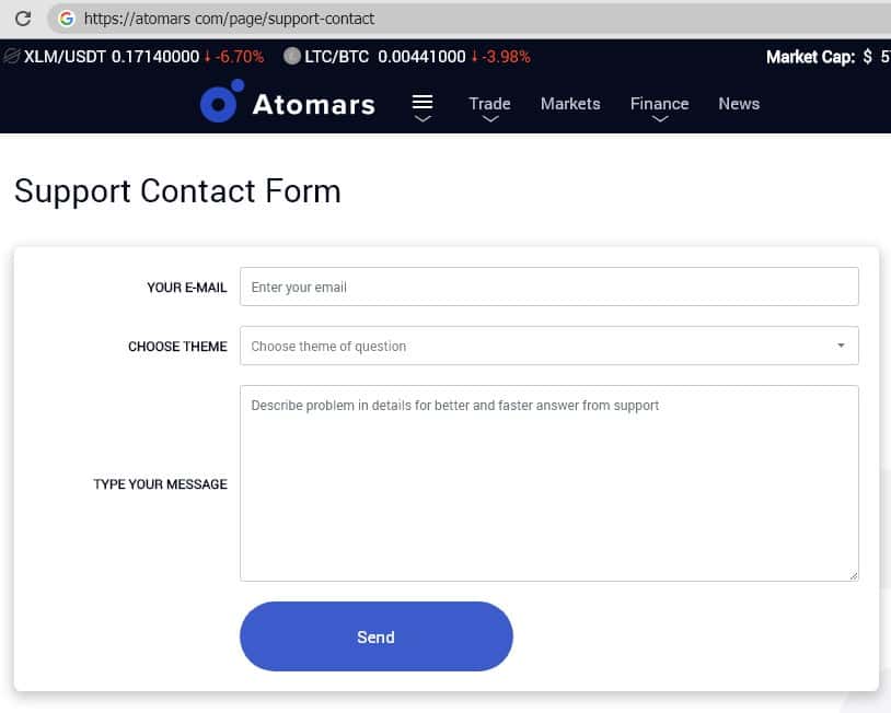Для связи своих клиентов и посетителей сайта криптобиржи с технической поддержкой своего проекта аферисты Атомарс предлагают использовать форму обратной связи.