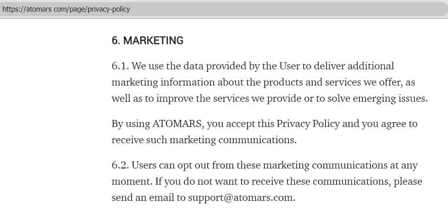 И лишь в недрах сайта, в разделе, посвященном политике конфиденциальности удается обнаружить адрес электронной почты технической поддержки криптообменника Атомарс: