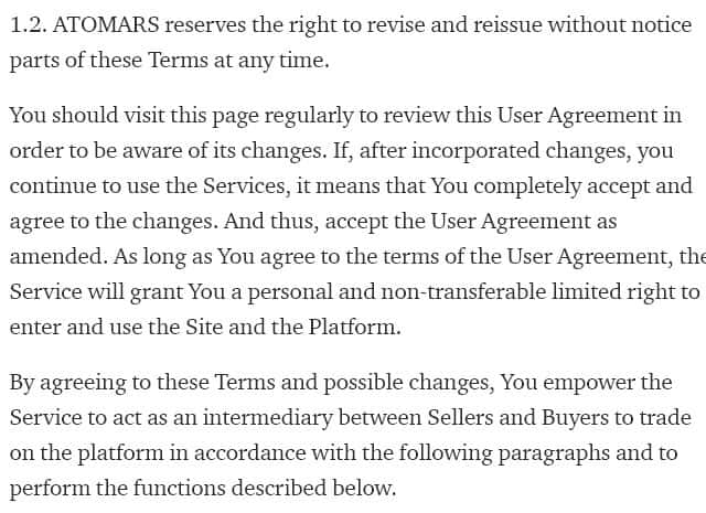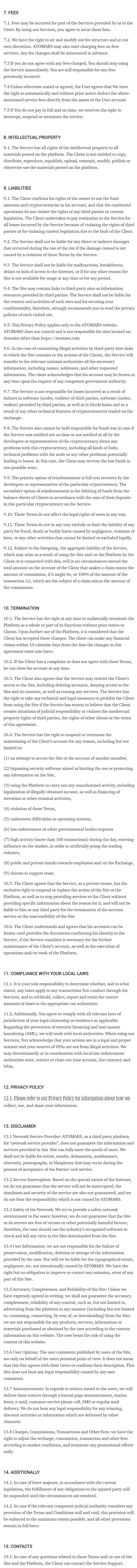Для более детального рассмотрения пунктов "Клиентского соглашения" на криптовалютной бирже Атомарс предлагаем ниже полный текст так называемых "Условий использования".