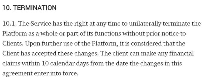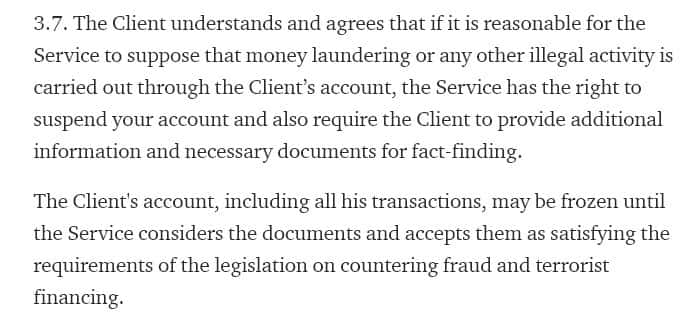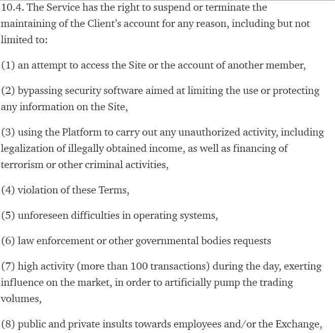 Администрация криптобиржи имеет право приостановить или прекратить обслуживание учетной записи клиента по любой причине с конфискацией денежного счета.