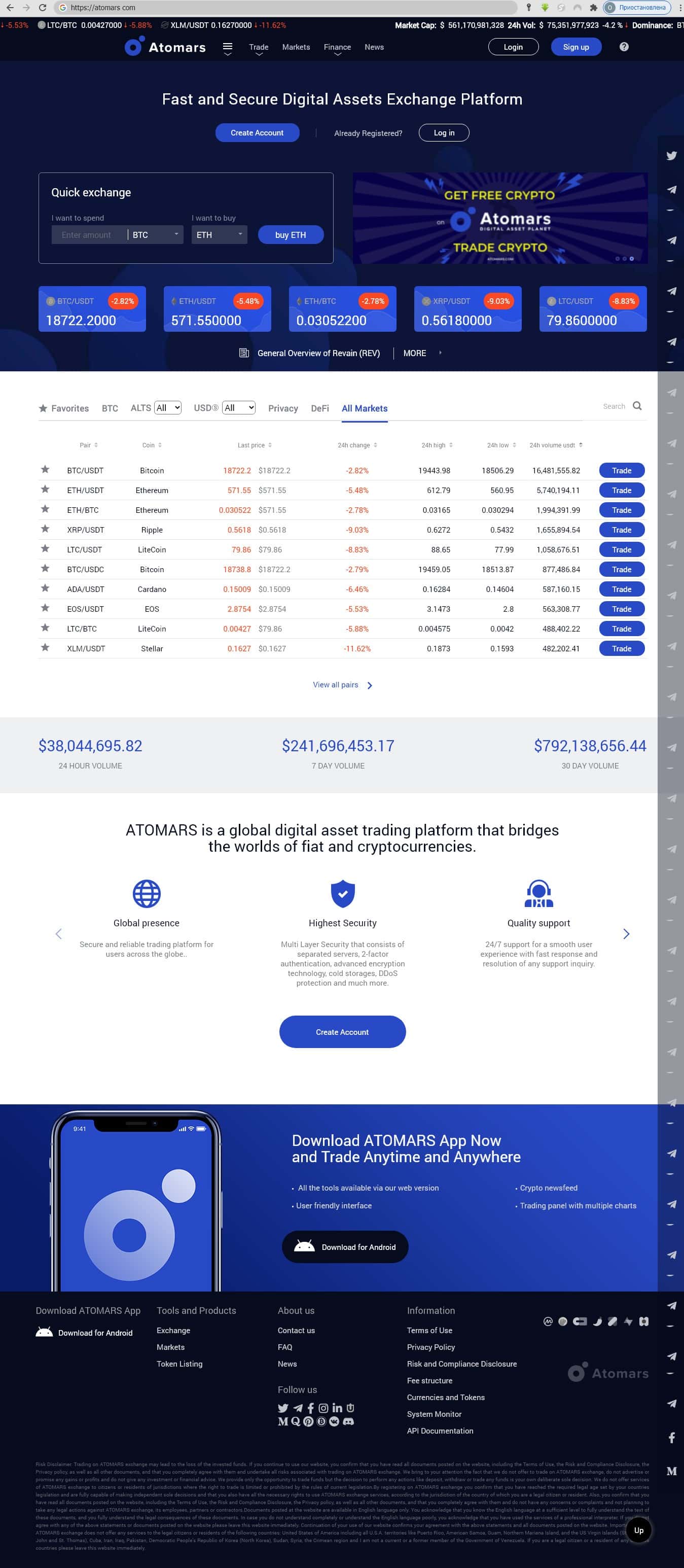 Главная страница, как и весь портал криптобиржи Атомарс выглядит с одной стороны довольно просто и обыденно, а с другой информативно, компактно и вполне практично.