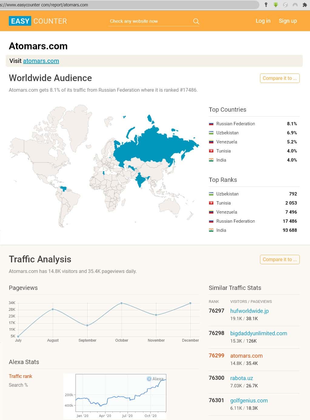 При рассмотрении аналитических данных о трафике сайта криптобиржи Атомарс, приведенных на портале easycounter наблюдаются незначительные расхождения с similarweb.