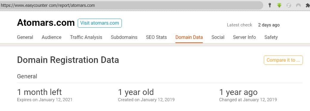 Интерес представляет информация, что до конца регистрационного периода домена остается всего один месяц, ведь домен зарегистрирован лишь на два года.