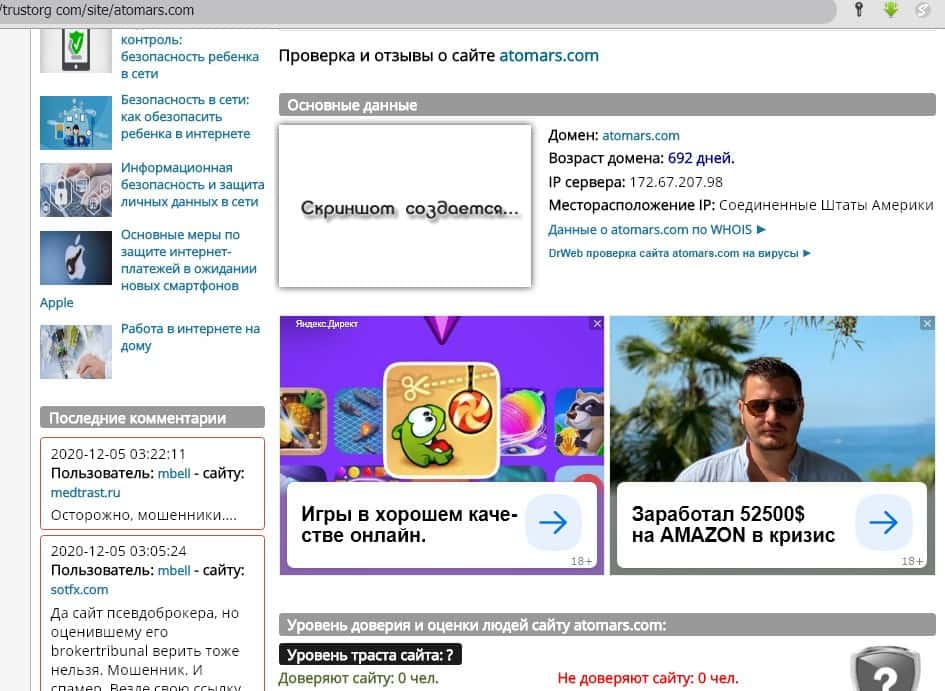 - Отсутствие доверия к услугам сайта криптобиржи Атомарс у портала "Доверие в сети"