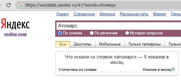 А поиском портала криптобиржи Атомарс в поисковой системе Яндекса озадачивалось совсем незначительное количество пользователей. За пределами рекламы спроса на биржу нет.