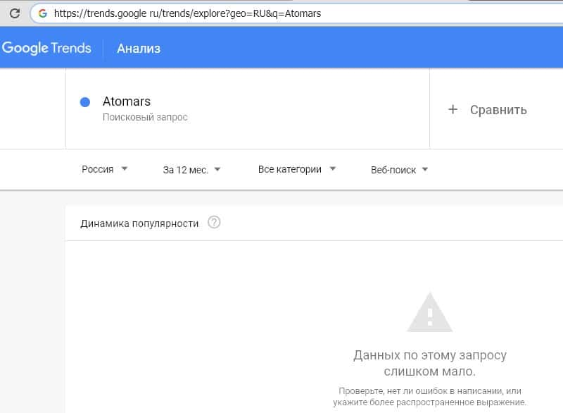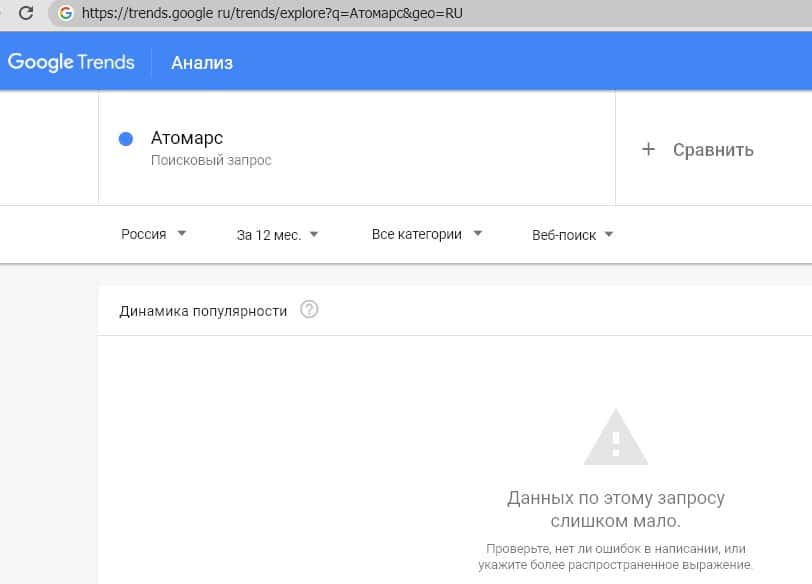 Нет и значительных данных в поисковой службе Google о поисковых запросах портала криптобиржи "atomars.com", что свидетельствует о низкой популярности этого лохотрона.