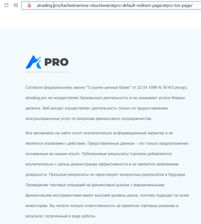 Компания ATrading Pro не зарегисрирована как юридическое лицо. На их сайте нет никакой информации, кто выступает от имени данного бренда. Это признак мошенничества.