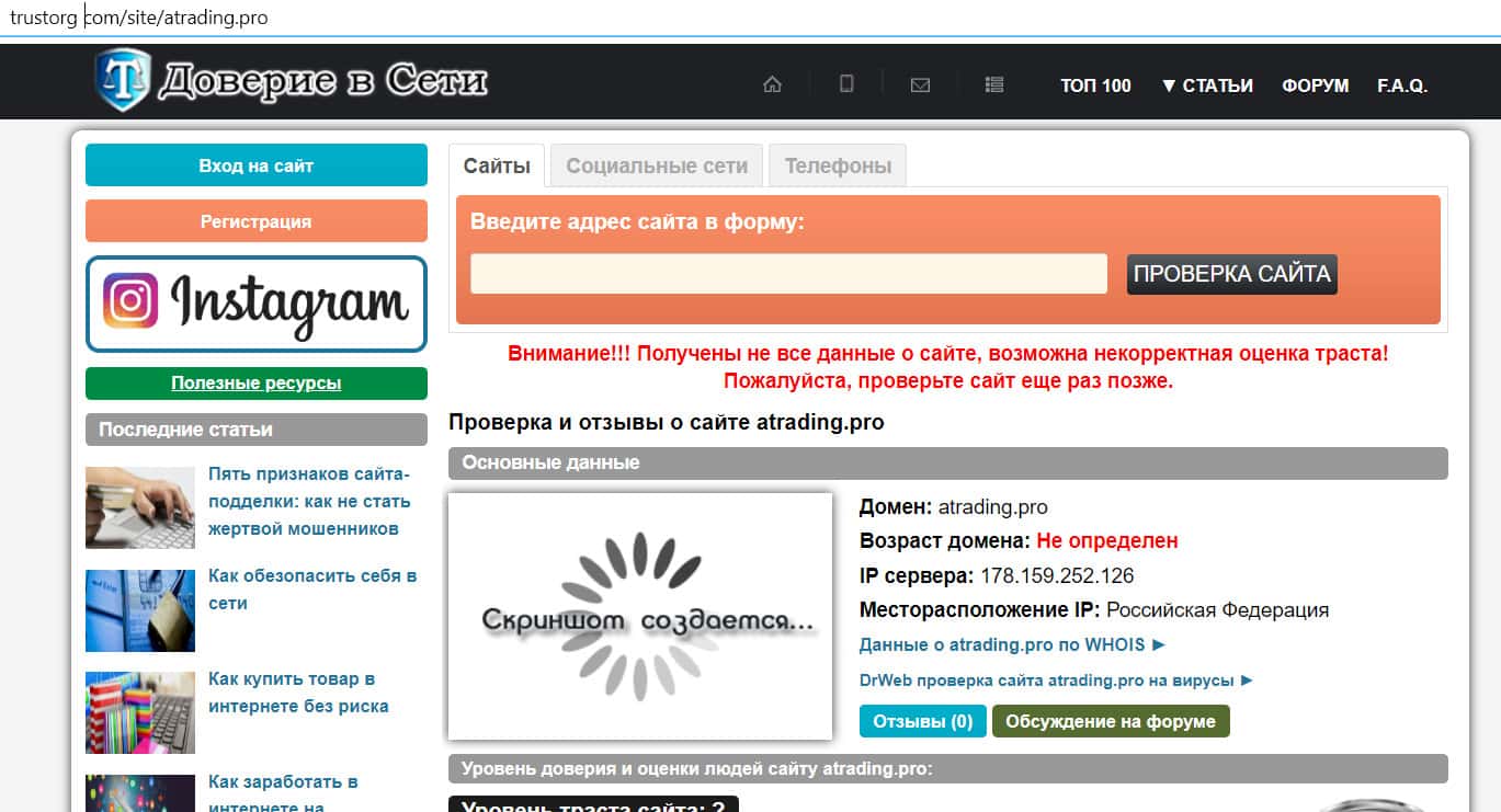 Возраст доменного имени сайта ATrading Pro определить не удалось. Скорее всего, владелец скрыл их. Так поступают все мошенники, чтобы скрыть данные о себе.