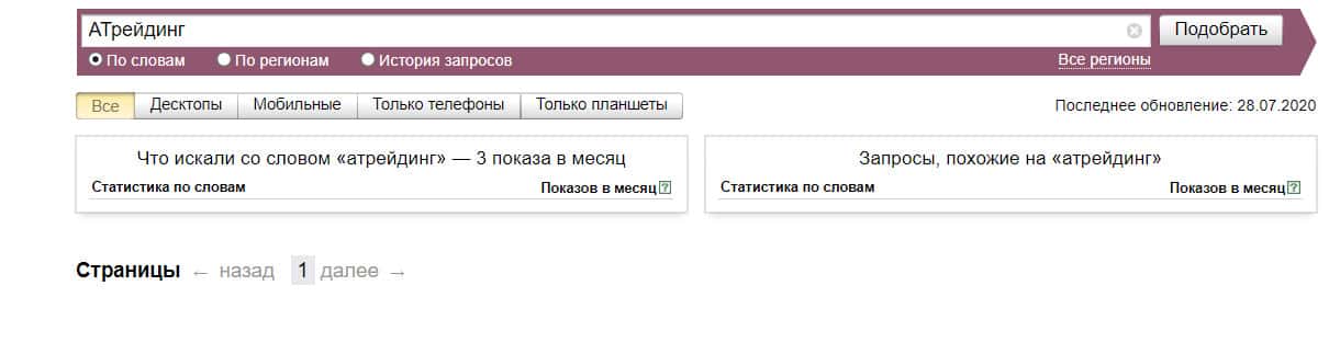 Название бренда "АТрейдинг" на русском языке пользователи искали в системе Яндекс всего лишь 3 раза за месяц.