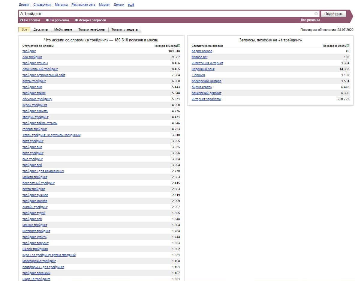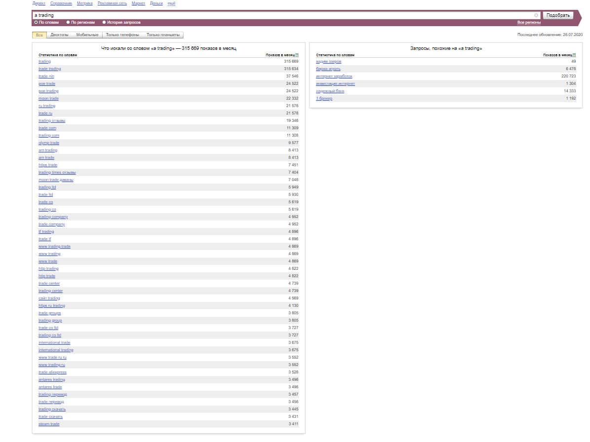 Если же вбить название бренда на английском языке, но с пробелом "a trading", результат будет таким: 315 669 раз за месяц. Это связано с понятием трейдинга, а не с данной конторой.