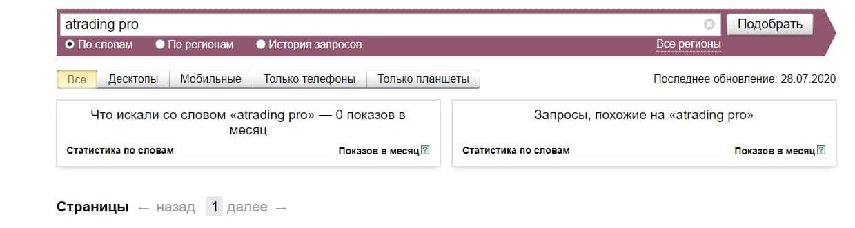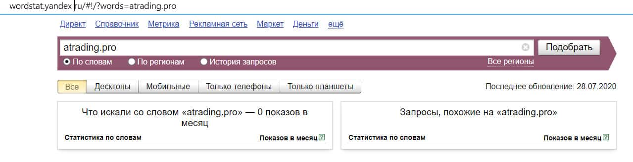 Проверка по запросам по доменному имени "atrading pro", написанному без точки с пробелом в поиске Яндекс дает следующий результат: ноль показов.