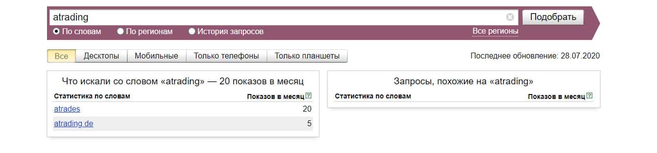 Посмотрим, какое количество пользователей искали в системе Яндекс название бренда "atrading" на английском языке: 20 человек.