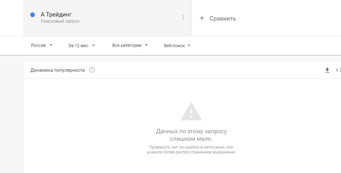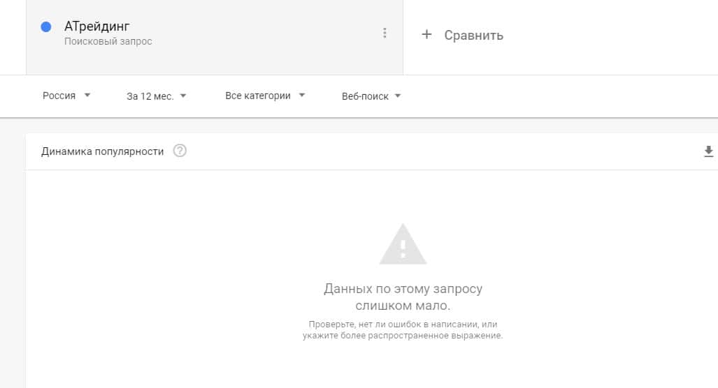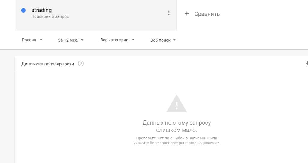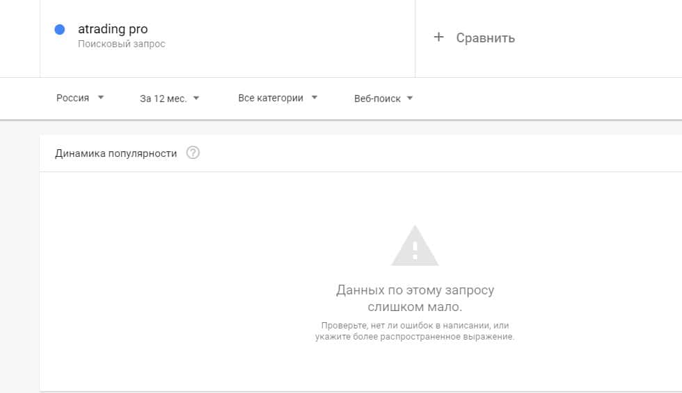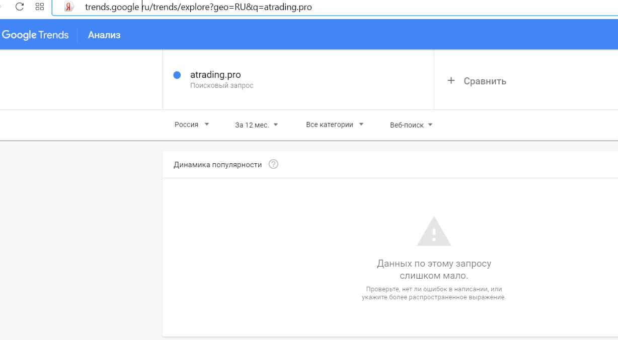 Количество запросов от пользователей по доменному имени "atrading.pro" в сервисе Гугл Тренд было очень небольшим.