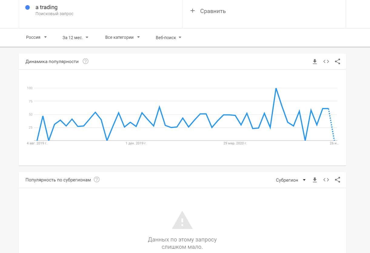 Название бренда "А Трейдинг" на русском языке с пробелами люди искали в системе Гугл небольшое количество раз.