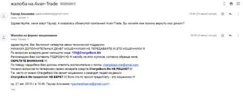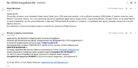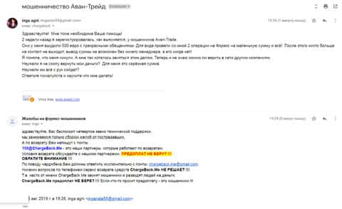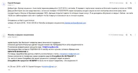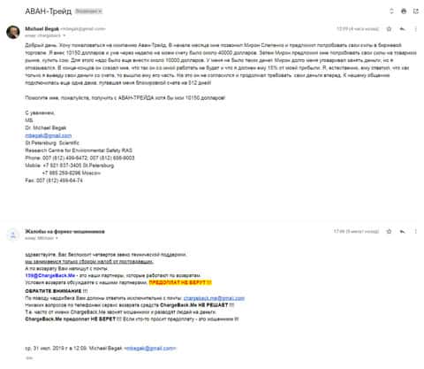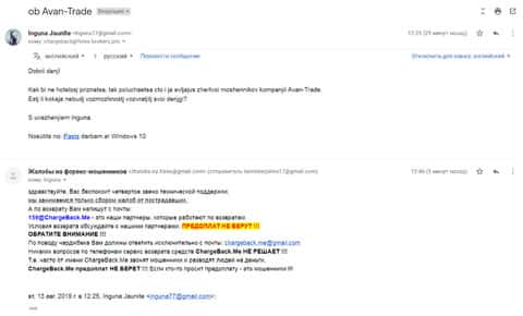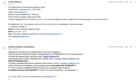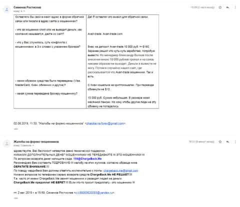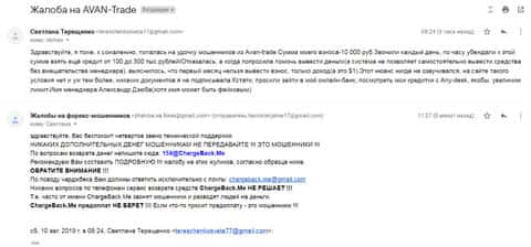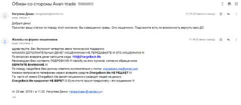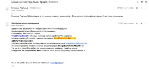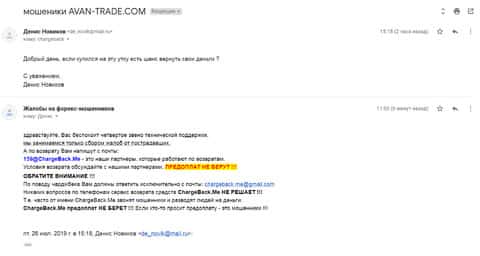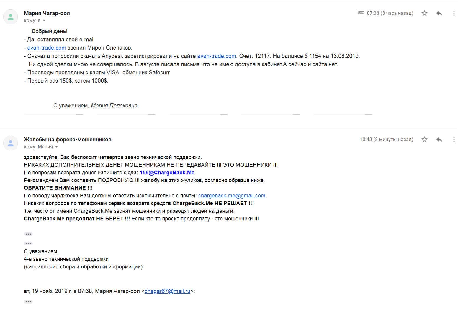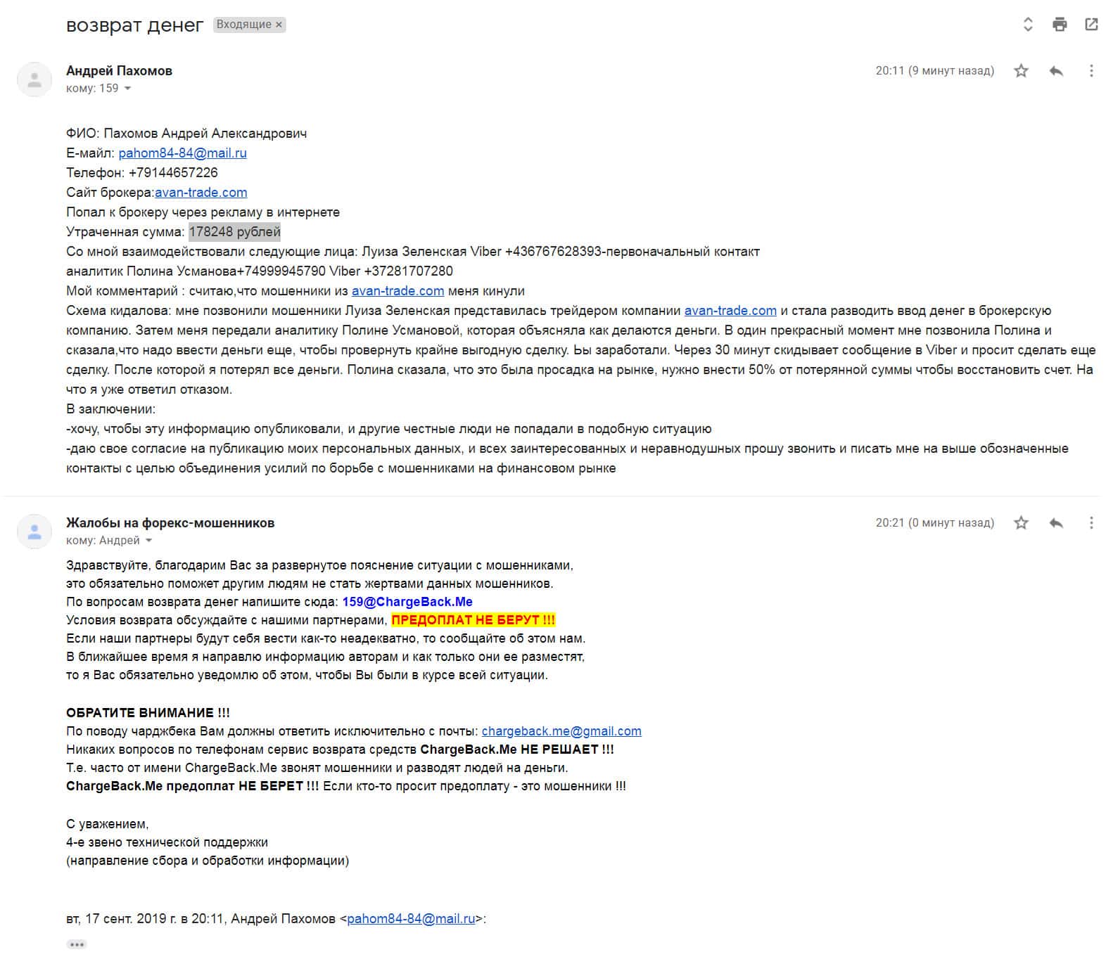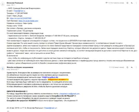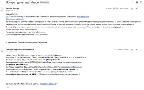 Очень краткое письмо, где человек зафиксировал факт мошенничества со стороны дилинговой конторы Avan-Trade и передал все данные в интернет-организацию ChargeBack.Me которая как раз и занимается вопросами возврата средств, украденных подобными мошенническими шарагами.