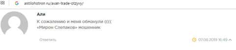 Один из отзывов в интернете, помимо кучи жалоб, поведал нам, как относится дилинговая контора Avan-Trade к своим клиентам. Человек пожаловался, что его обманули и главным разводилой, который фигурировал в схеме развода был некий мошенник под псевдонимом Мирон Слепаков.