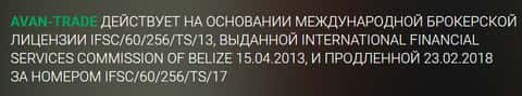 Касательно лицензии на деятельность конторы Avan-Trade, у мошенников указана информация, что они действуют на основании лицензии выданной Финансовой Комиссии Белиза, но есть несколько нюансов, которые не вписываются в здравомыслие. Один из них, который самый явный, это то что она продлена до 2018 года, а на дворе уже 2019 год.