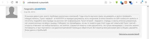 На портале onlinebrands, на котором идут бурные обсуждения насчет всяких брокеров-мошенников, обворовавшие почти половину населения планеты, и, разбогатевшие на чужом горе. Пользователем форума Георгием было написано, что отдав свои последние деньги брокеру АвантФХ вы сделаете правильный выбор и получите такую выгоду от ваших вложений, что вам и в снах не снилось.